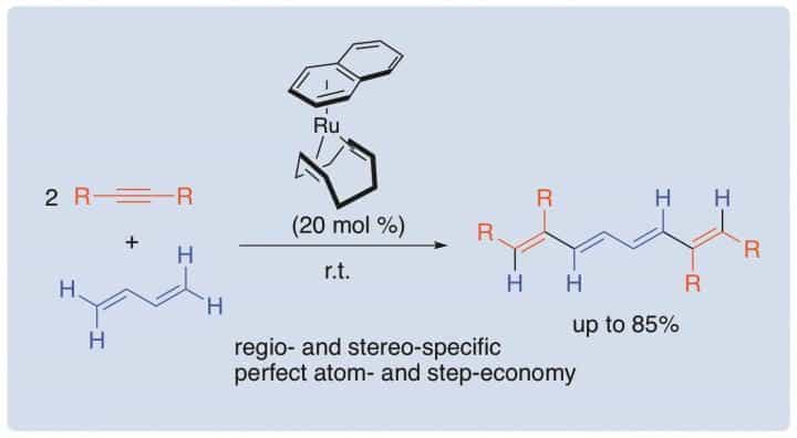 Conjugated tetraenes are important key substructures in electronic materials, natural products and pharmaceutical molecules. However, they are difficult to synthesize. They are conventionally prepared by repetitions of the stoichiometric reactions using phosphorus reagents and subsequent reduction and partial oxidation. For making one C=C double bond, one needs to conduct 3 step reactions by this procedure. […]