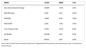 Chinese equities declined during this holiday-shortened week. (Markets in China were closed on Monday in celebration of the Dragon Boat Festival.) The Shanghai Composite Index slid by 0.61% and the blue-chip CSI 300 fell by 0.91%. Hong Kong’s benchmark Hang Seng Index plunged by 2.31%. In China’s inflation readings, the country’s consumer price index (CPI) rose by 0.3% in May from a year earlier and is still lower than expectations, unchanged from its rise in April. Core inflation (which excludes volatile food and energy costs) climbed by 0.6% which is slower than the 0.7% increase in April. The producer price index (PPI) fell by 1.4% year-on-year, declining for 20 consecutive months, but eased from a 2.5% drop in April. Factors that kept a lid on prices in China were weak consumer confidence and a protracted property sector slump which prevailed despite numerous measures adopted by Beijing to prop up the markets and the economy over the past year. Highlighting consumer caution in China was data from the Dragon Boat Festival. The Ministry of Culture and Tourism reported that over the three-day holiday, tourism revenue rose by 8.1% over the 2023 results but still lagged pre-pandemic levels. While it was encouraging to note that domestic traffic rose by 6.3% from last year, average spending per traveler, however, fell by 12.3% from 2019. Analysts expect Beijing to continue rolling out support to spur demand in light of the weak consumer sentiment dragging down the economy.
